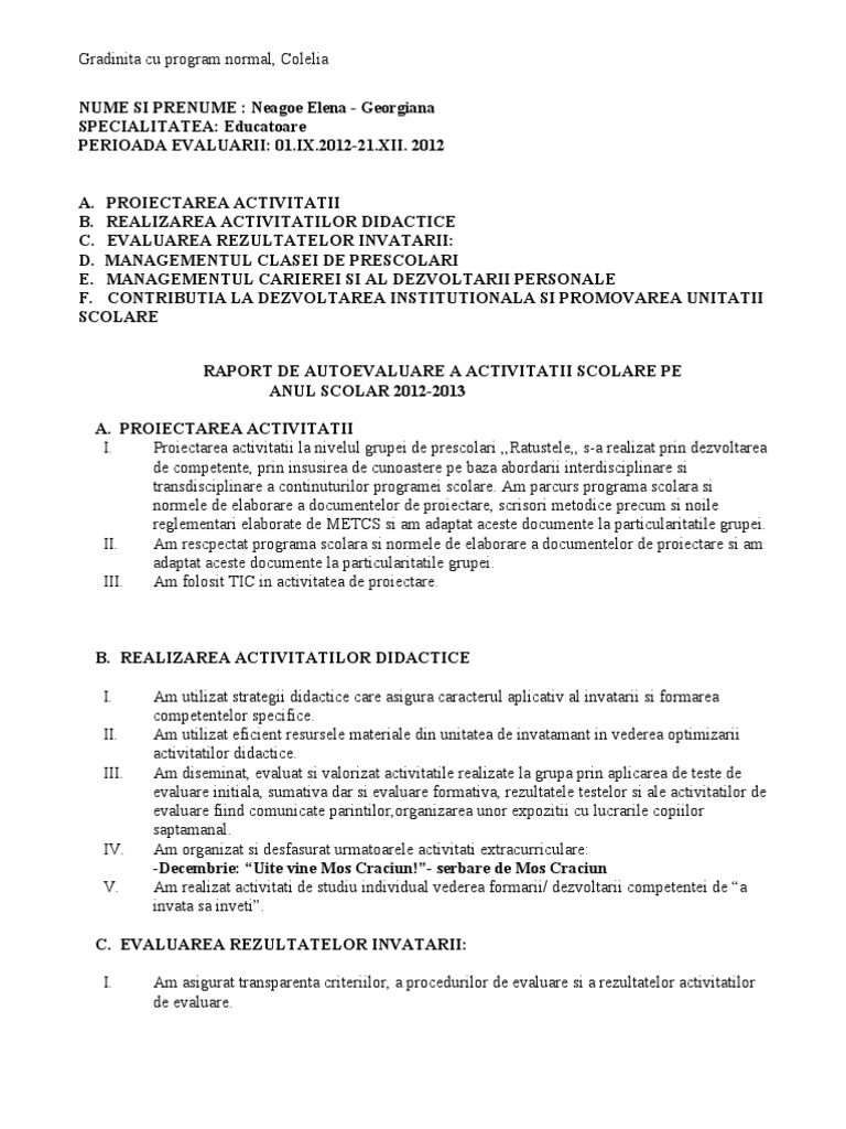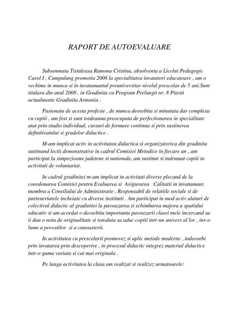 Salvaresalvați raport autoevaluare educatoare pentru mai târziu. Îmbunătăţirea continuă a competenţelor profesionale profesoară de limba şi literatura română 2016. Raport de autoevaluare educatoare raport de autoevaluare pentru confirmarea gradului didactic raport de activitate profesor.