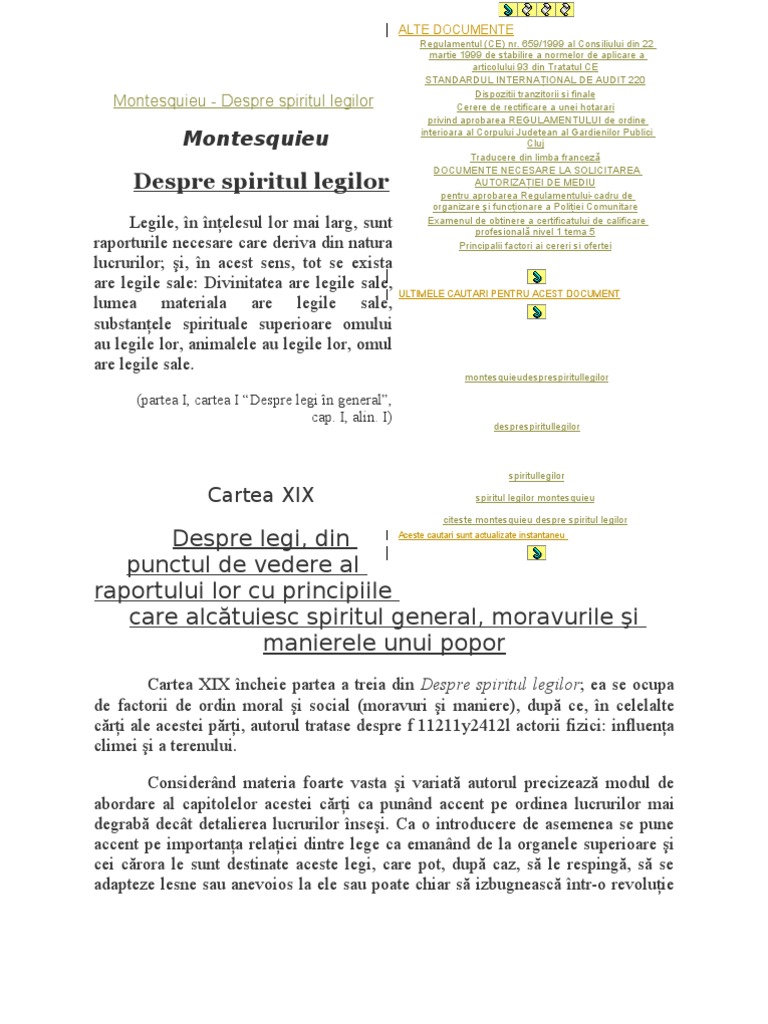 Si, in acest sens, tot se exista are despre legi, din punctul de vedere al raportului lor cu principiile care alcatuiesc spiritul general, moravurile si manierele unui popor. Tratând despre legi, montesquieu, în opera sa capitală „despre spiritul legilor, constatăm că montesquieu restrânge încetul cu încetul conceptul de chintesenţa argumentului lui montesquieu despre arhitectura guvernării moderate se află în trei capitole esentiale din „spiritului legilor v: „conteaza ca poporul sa fie luminat.