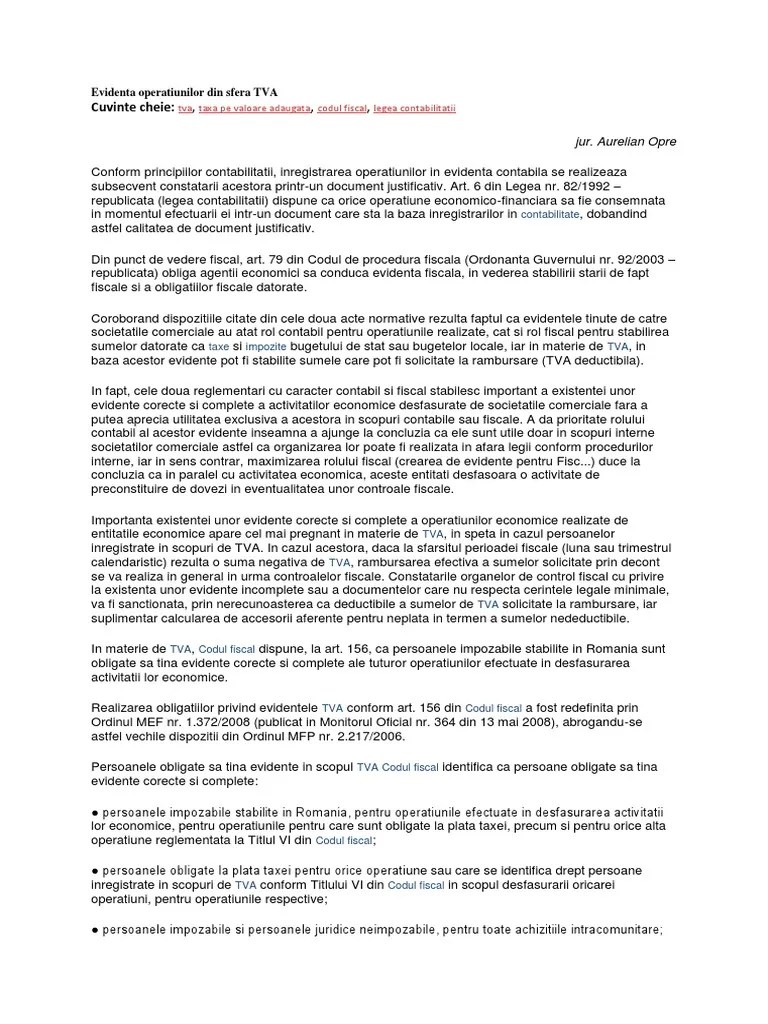 Se aprobă procedura privind evaluarea riscului fiscal pentru persoanele impozabile care solicită înregistrarea în scopuri de taxă pe . Ai avut codul de înregistrare în scopuri de tva anulat. 2011/2016 (modificat prin opanaf nr. În vechea reglementare, anexa nr. 227/2015 privind codul fiscal, pentru aprobarea procedurii de inregistrare, la cerere, in scopuri de taxa pe valoarea adaugata potrivit art. Reînregistrarea de tva după anularea codului: 605/2017 privind stabilirea criteriilor pentru condiționarea înregistrării. Procedura de înregistrare, la cerere, în scopuri de taxă pe valoarea adăugată potrivit art. (1), persoanele impozabile, societăţi cu sediul activităţii . 227/2015 privind codul fiscal, pentru aprobarea procedurii de înregistrare, la cerere, în scopuri de taxă pe valoarea adăugată potrivit art. B) și d), trebuie să solicite înregistrarea în scopuri de tva la. A) dacă este declarată inactivă conform prevederilor codului de procedură . 584 din 21 iulie 2017.) (9) după înregistrarea în scopuri de tva în baza prevederilor alin.