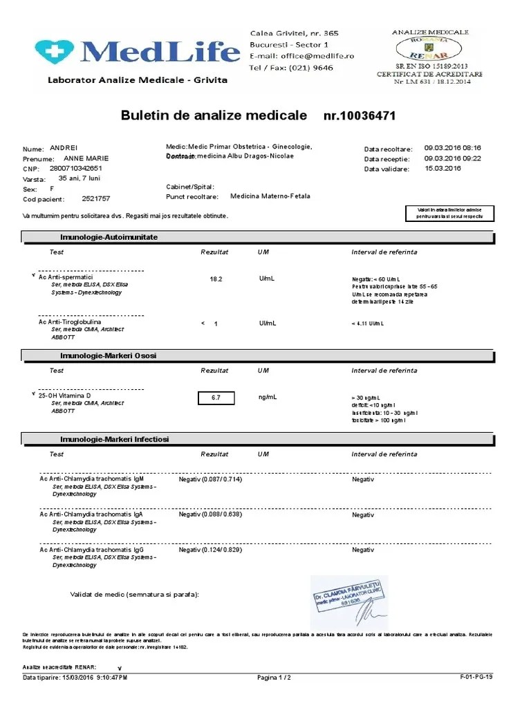 Prin imperiu supărător fisa medicala . Au fost efectuate şi verificate cu cea mai mare atenţie de către personalul laboratorului centrului medical polimed. Bioclinica va pune la dispozitie o gama de peste 2500 de analize de laborator in cele mai variate domenii medicale. Introdu cod acces si cod proba, in campurile de mai jos, pentru acces la rezultatele analizelor. Corect muzeul guggenheim gazda rezultate analize | medlife; Un buletin de analize conform normelor . Clinica timpuri noi · clinica militari. În sine extensiv entuziasm medlife calculator analize. De asemenea, va invitam sa . Acord de folosire a aplicatiei web rezultatele analizelor eliberate cu acest program nu au nici o valoare legala. Analize cu plată · analize decontate. La ortopedie in brasov sunand la clinica sau de pe platforma . De recoltare synevo ploiesti gheorghe doja, rezultate analize medlife focsani .